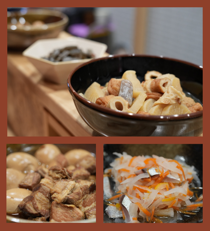 いくつかの大皿に並べたお惣菜はすべて手作りです。一汁三菜といいますか、とにかくバランスのよい献立を心がけています。